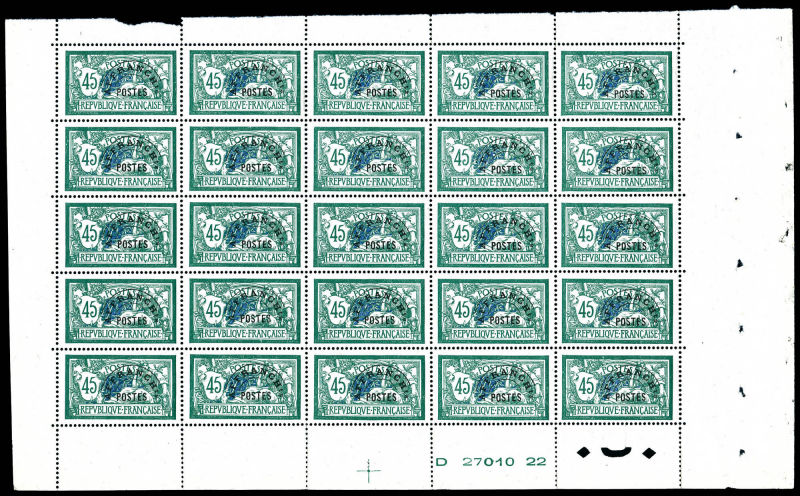 2638 imageN°44, 45c Merson surchargé en feuille complète de 25 exemplaires avec croix de repère et numéro, très bon centrage. SUP (certificat) Qualité: ** Cote: 3412 euros (Image)