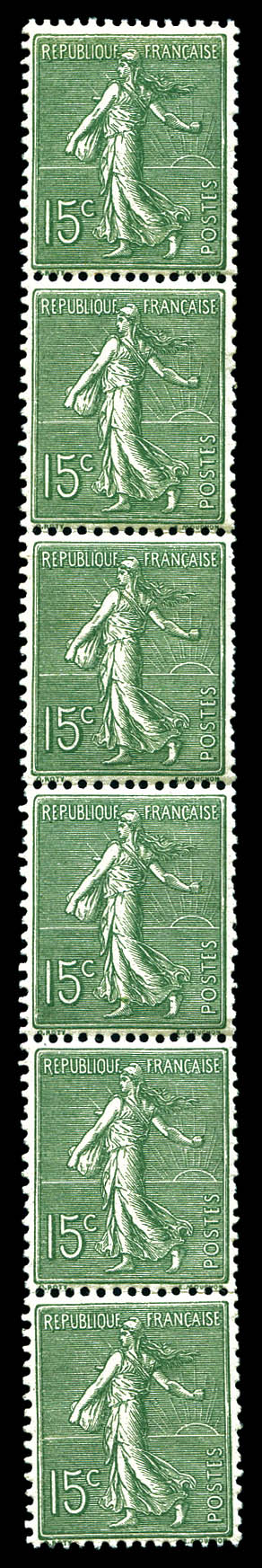 2655 imageN°3, 15c Semeuse lignée vert-gris, bande de 6 exemplaires. SUP. R.R. (certificat) Qualité: ** Cote: 1650 euros (Image)