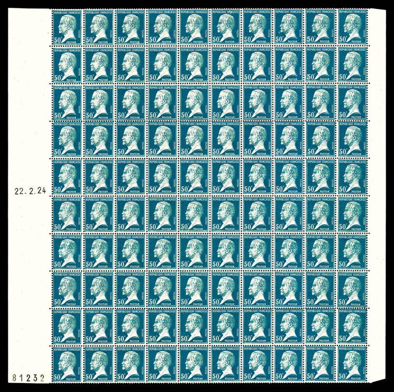 2660 imageN°11, 50c Pasteur (N°176a) en feuille complète de 100 exemplaires datée du 22.2.24 et numérotée (81232) sur le bord de feuille à gauche . SUPERBE. R.R.R. (certificat) Qualité: ** Cote: 49800 euros (Image)