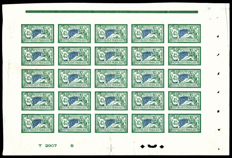 2693 imageN°143b, 45c vert et bleu non dentelé en feuille de 25 exemplaires avec numéro de feuille et croix de repère, R.R.R et SUPERBE (certificat) Qualité: ** Cote: 15000+ euros (Image)