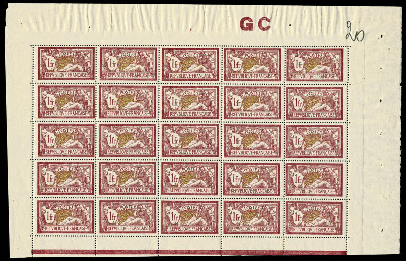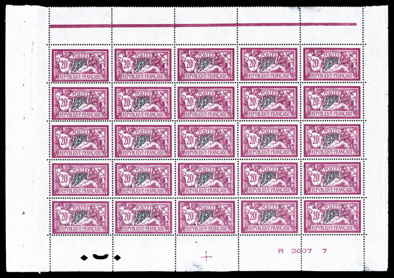 2740 imageN°208, Merson, 20F lilas-rose et vert-bleu en feuille de 25 exemplaires avec croix de repère et numéro de feuille, infime froissure sur 3 exemplaires mais très bon centrage et grande fraîcheur, rare et SUP (signé Brun/certificat) Qualité: ** Cote: 15000 euros (Image)