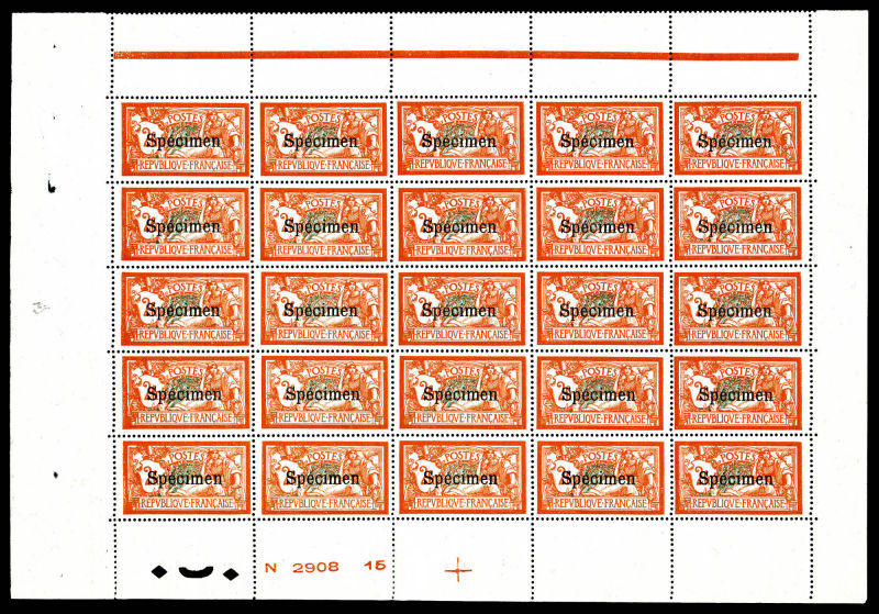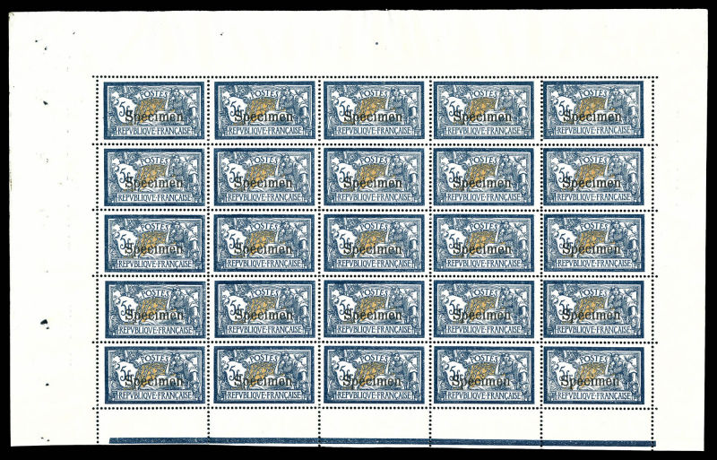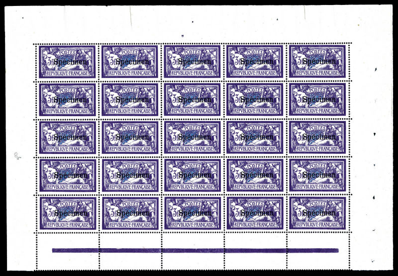 2723 imageN°123-CI 3, 5f Merson surchargé 'SPECIMEN', panneau de 25 exemplaires. SUP. R. (certificat) Qualité: ** Cote: 12500 euros (Image)
