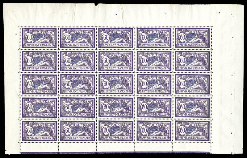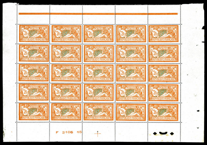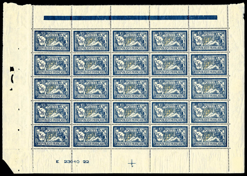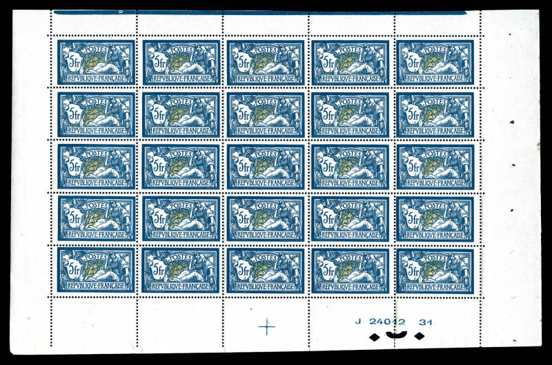2725 imageN°123a, Merson, 5F bleu et olive en feuille de 25 exemplaires avec croix de repère et numéro, très bon centrage et fraîcheur postale, rare et SUP (certificat) Qualité: ** Cote: 10625 euros (Image)
