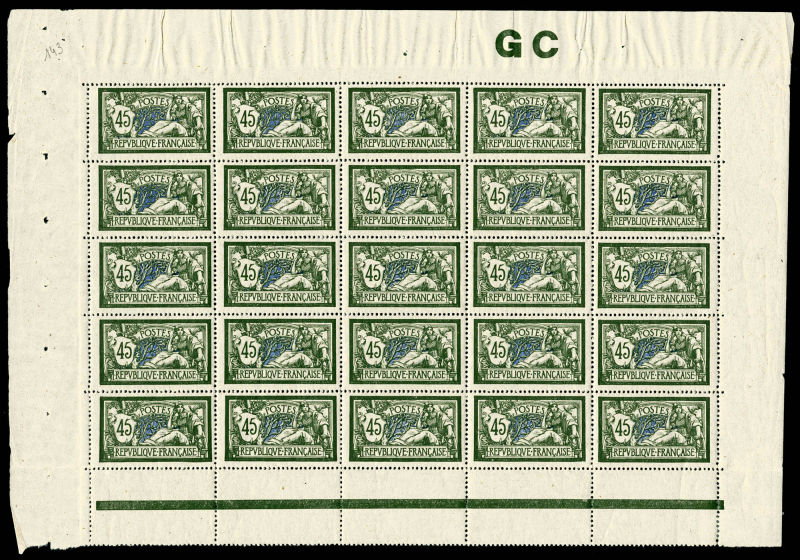 2728 imageN°143d, 45c vert-noir et bleu foncé papier GC en feuille de 25 exemplaires avec manchette, très bon centrage, SUPERBE (certificat) Qualité: ** (Image)
