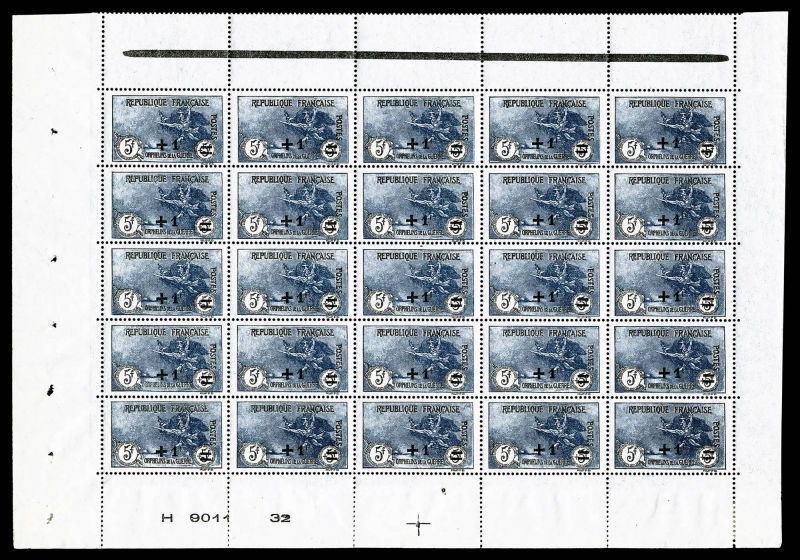 2735 imageN°169, Orphelins, +1F sur 5F +5F noir et bleu-gris en panneau de 25 exemplaires bas de feuille avec numéro et croix de repère, très bon centrage, SUP (signé Brun/certificat) Qualité: ** Cote: 11250 euros (Image)