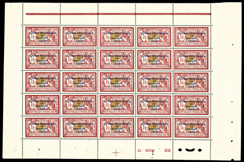 2736 imageN°182, Congrès de Bordeaux de 1923 en feuille de 25 exemplaires avec liseret, numéro et croix de repère, fraîcheur postale, très bon centrage, pièce superbe et rare (certificat) Qualité: ** Cote: 25000+ euros (Image)