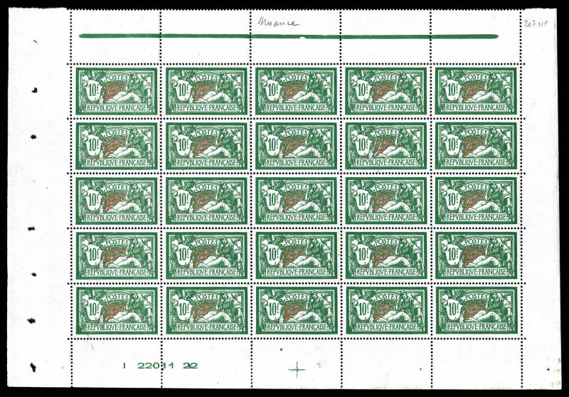 2739 imageN°207, 10f Merson vert et rouge en panneau complet de 25 exemplaires avec croix de repère et numéro. Très bon centrage. SUPERBE. R (certificat) Qualité: ** Cote: 15000 euros (Image)