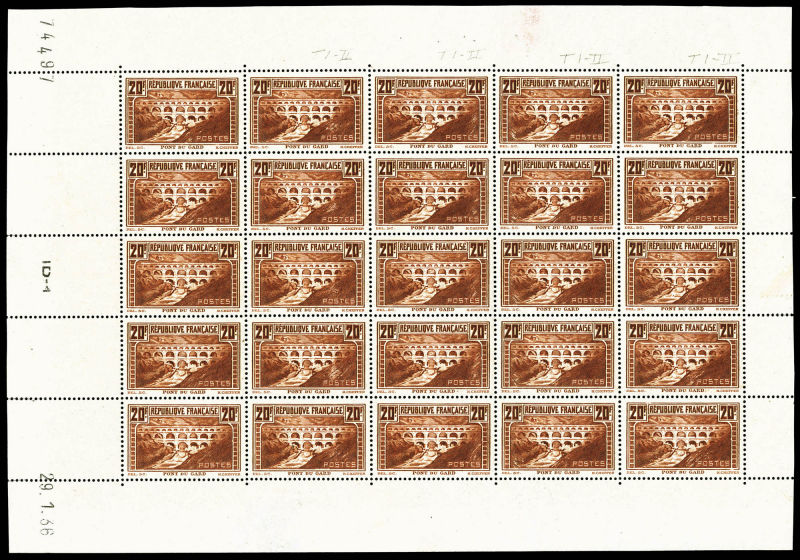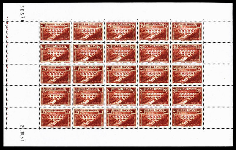 2745 imageN°262b, Pont du Gard, 20F chaudron clair (rivière blanche) en feuille complète de 25 exemplaires datés du 30/10/1931, pièce superbe et rare (certificat) Qualité: ** Cote: 15625 euros (Image)