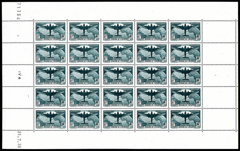 2754 imageN°321, Traversée de l'Atlantique Sud en feuille complête de 25 exemplaires daté du 31/7/36, RARE et SUPERBE (certificat) Qualité: ** Cote: 20000 euros (Image)