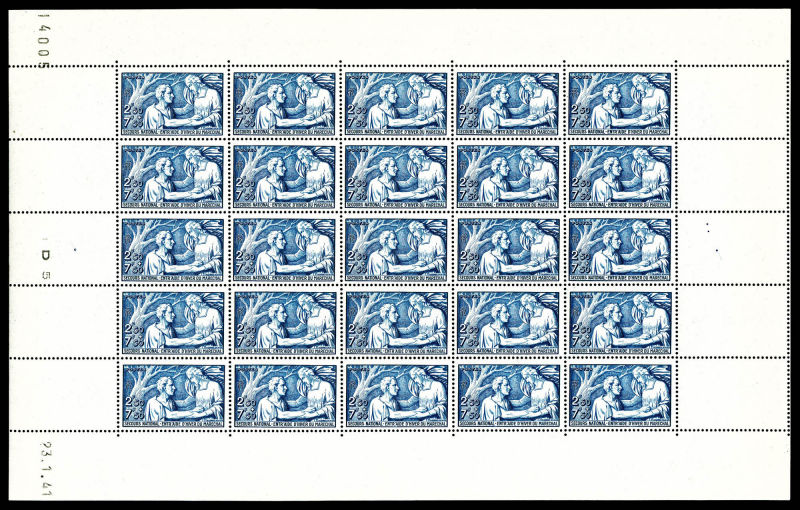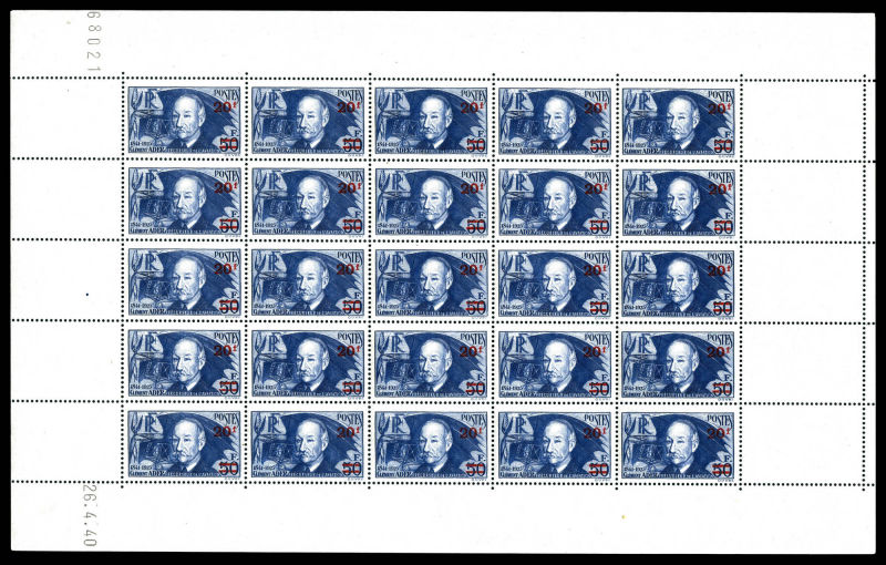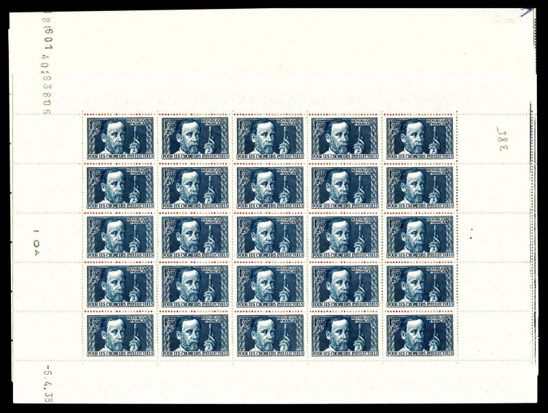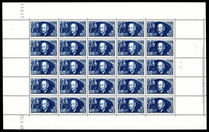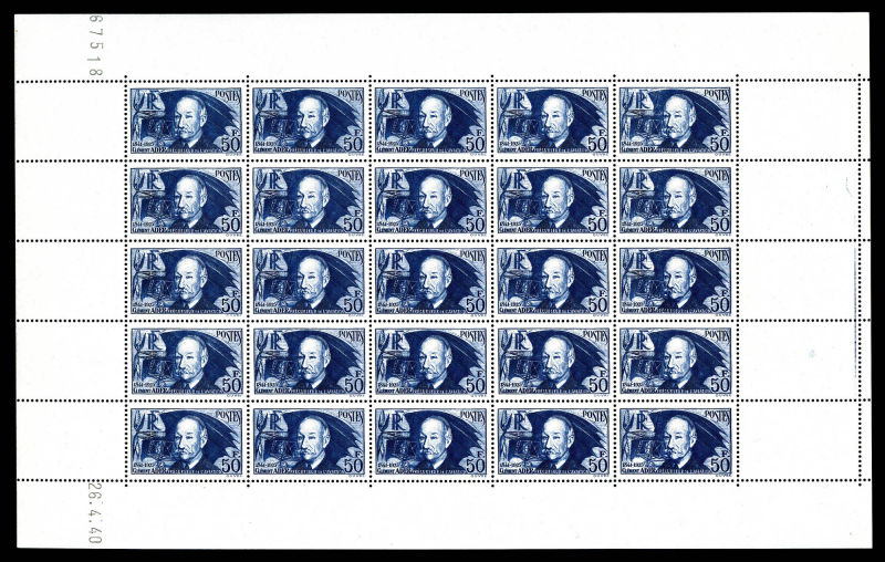 2759 imageN°493, Clément Ader surchargé: 20F sur 50F outremer-foncé en feuille complête de 25 exemplaires daté du 26/4/1940, TTB (certificat) Qualité: ** Cote: 2125 euros (Image)