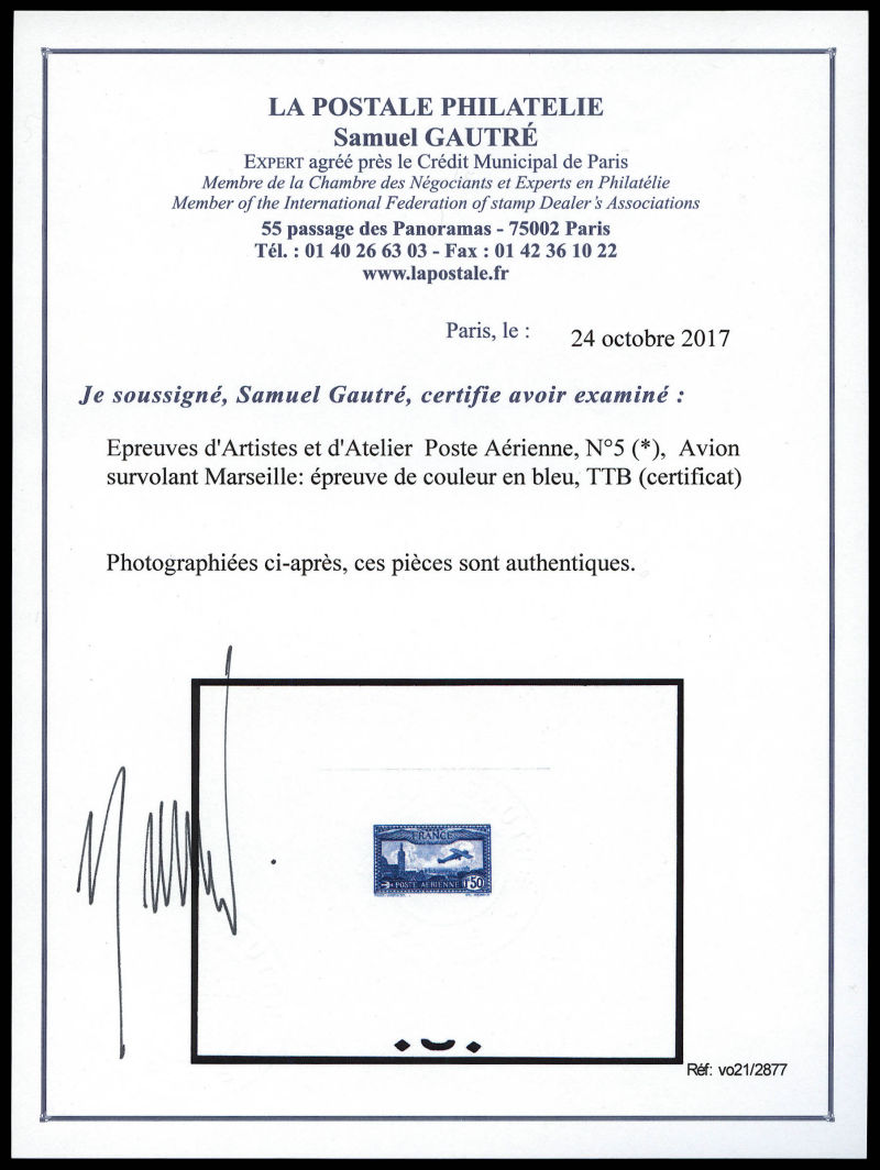 2882 imageAvion survolant Marseille: épreuve de couleur en bleu-outremer. TTB (certificat) Qualité: (*) (Image)