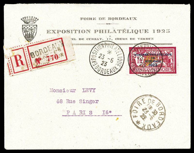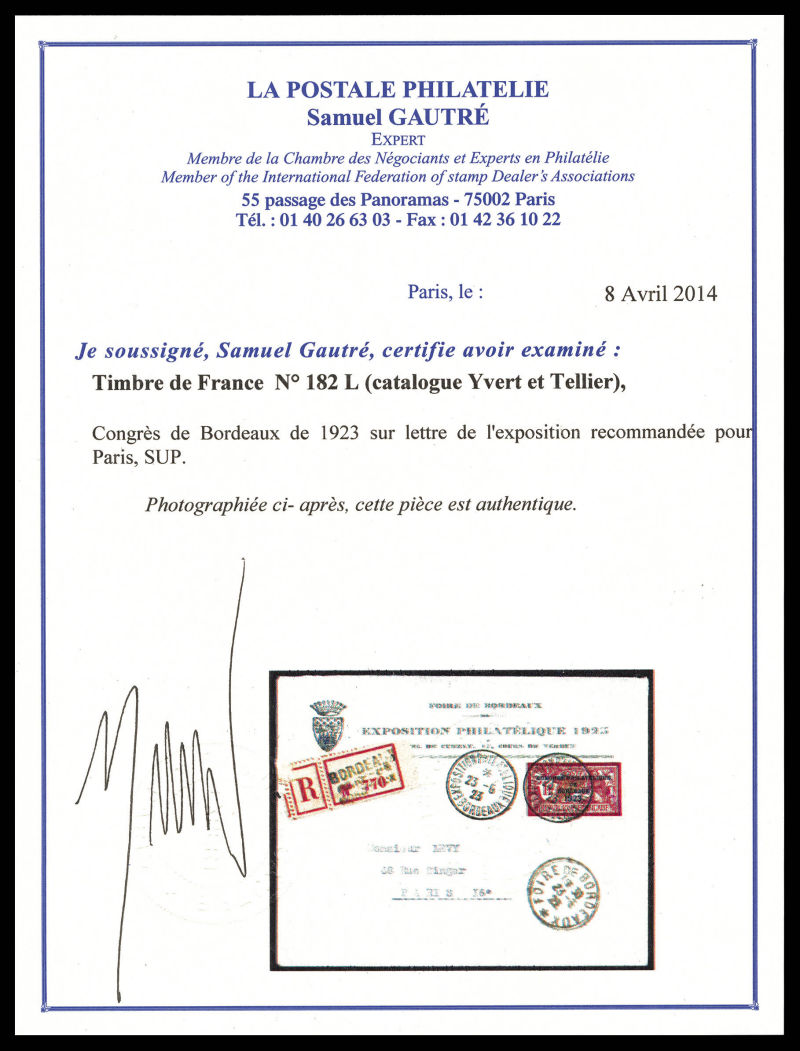 2899 imageN°182, Congrès de Bordeaux 1923, Càd de l'exposition du 23 juin 1923 sur lettre recommandée, bon centrage, TB (certificat) Qualité: Oblitéré Cote: 700 euros (Image) (image2) (All Images)