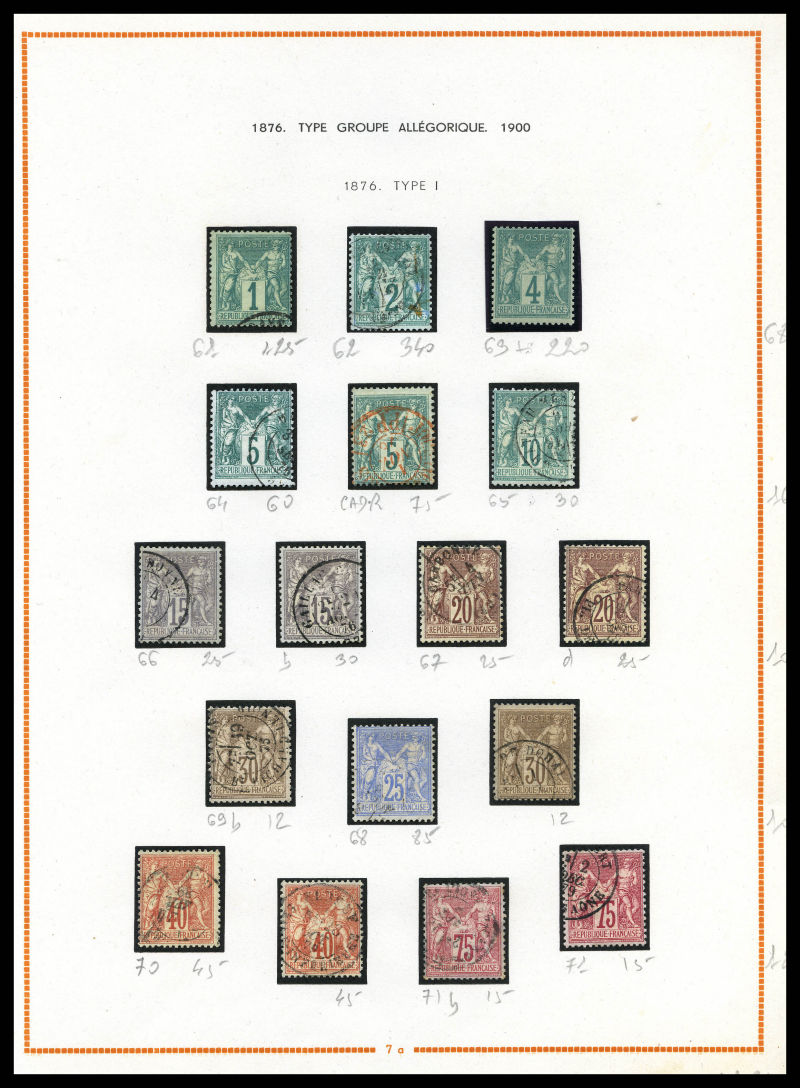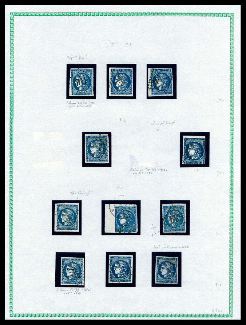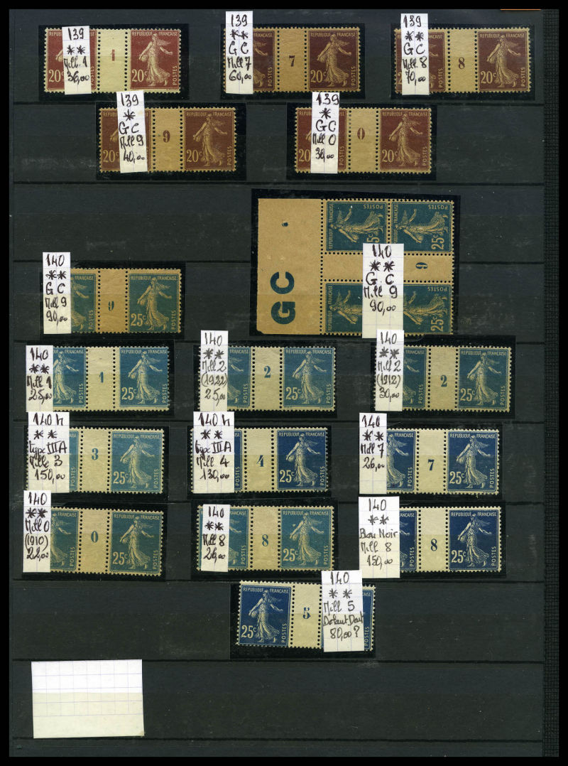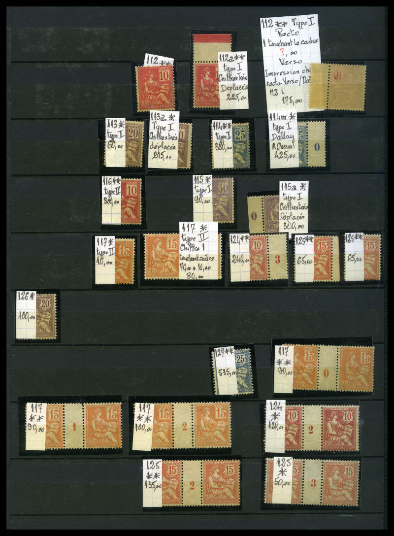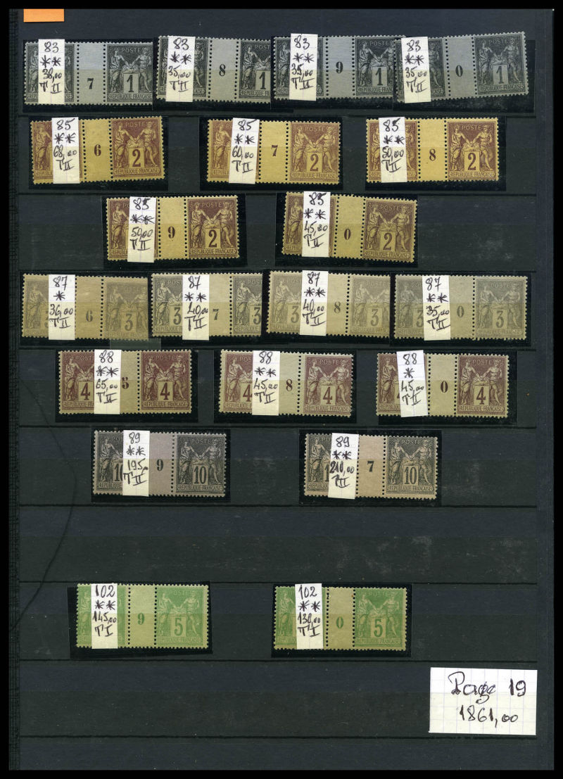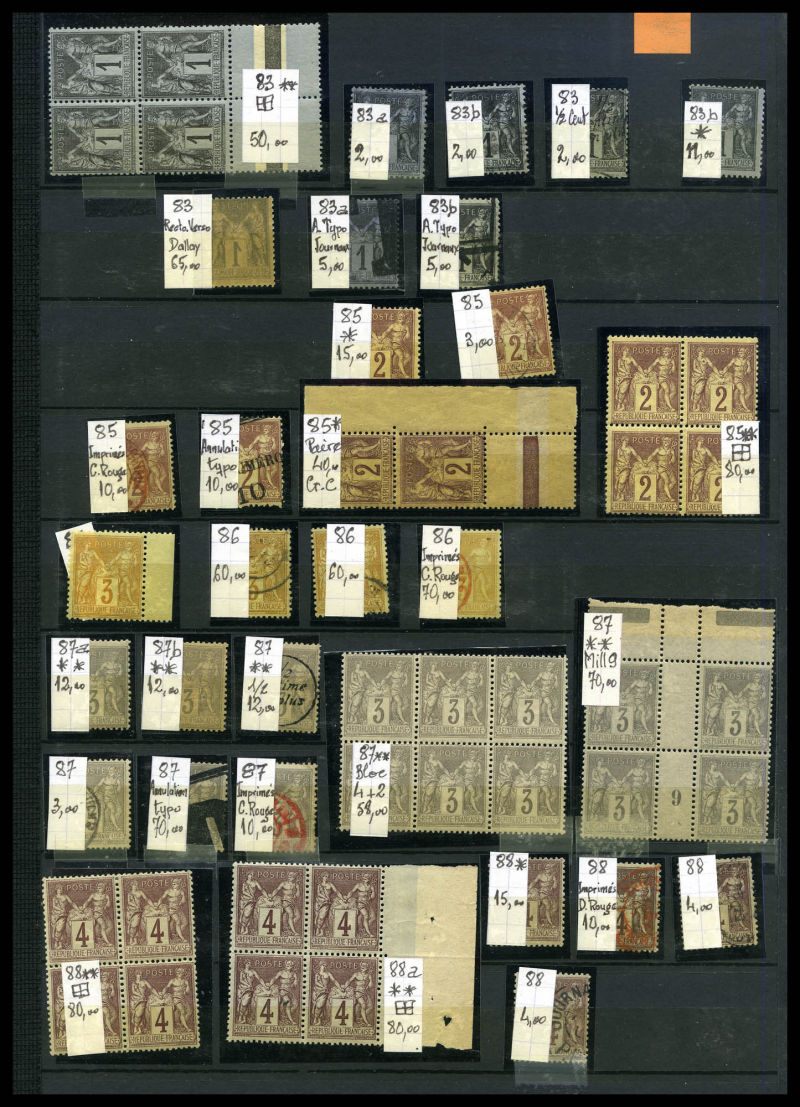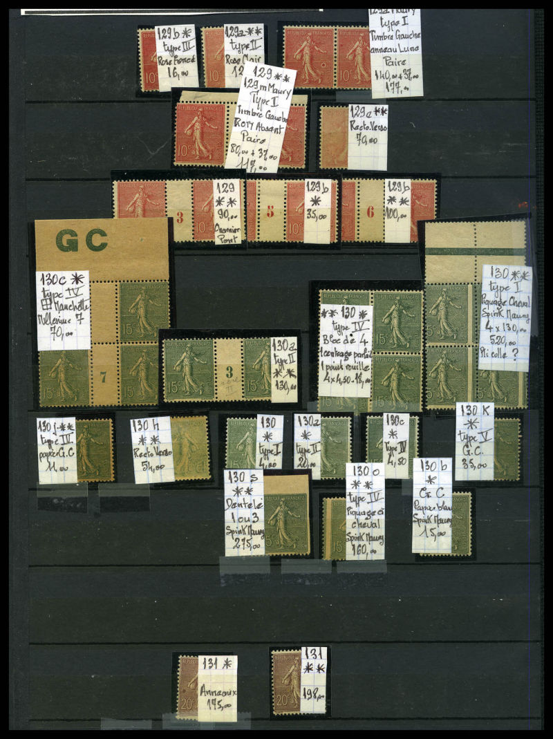 collection présentée en un gros classeur comprenant des timbres neufs et oblitérés dont oblitérations, nuances, paires, bandes, blocs, millésimes, roulettes, coins datés, nombreuses variétés dont plis accordéon, piquages, recto-verso, types,