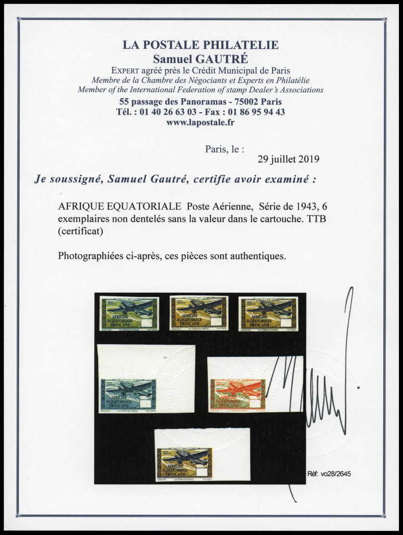 3083 imageN°41, timbres de 1943, 7 exemplaires non dentelées sans indications de valeurs. TTB (certificat) Qualité: ** (Image) (image2) (All Images)