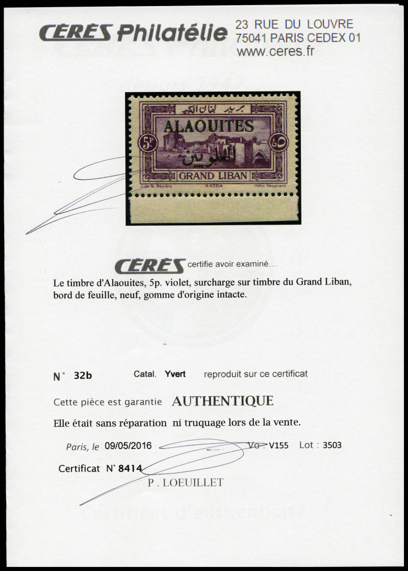 3095 imageN°32b, 5 pi violet sur tp n°60 du Grand Liban, bdf. SUP (signé Brun/certificat) Qualité: ** Cote: 360 euros (Image) (image2) (All Images)