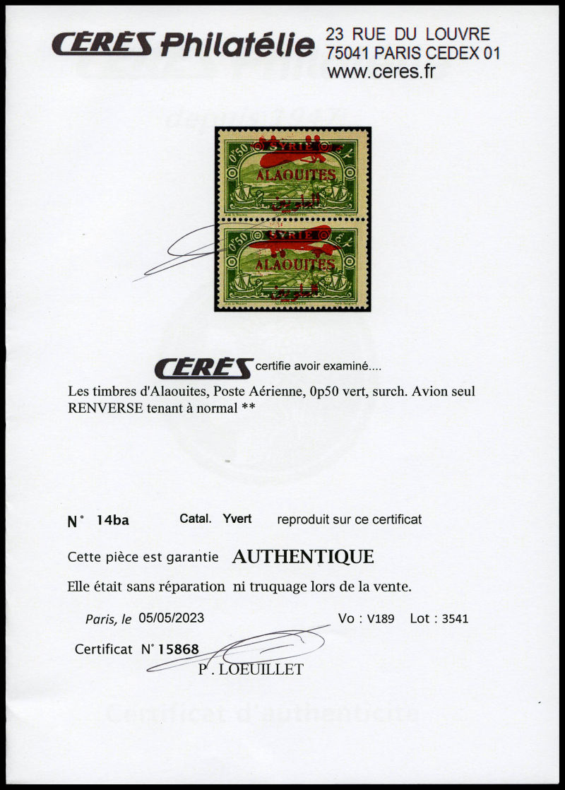 3111 imageN°14ba, Avion seul renversé tenant à normal en paire. SUP (certificat) Qualité: ** Cote: 460 euros (Image) (image2) (All Images)