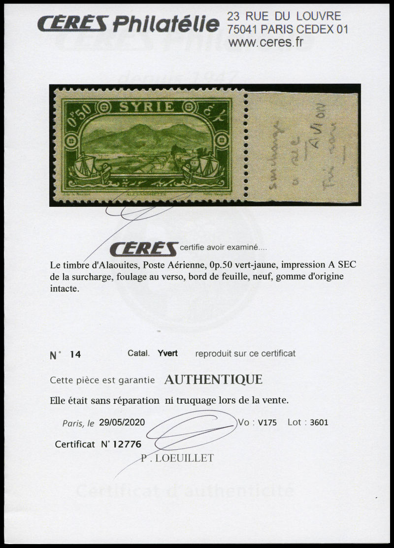 3112 imageN°14, 0 pi 50 vert-jaune: surcharge ALAOUITES en noir (non repertorié). TTB (certificat) Qualité: ** (Image)