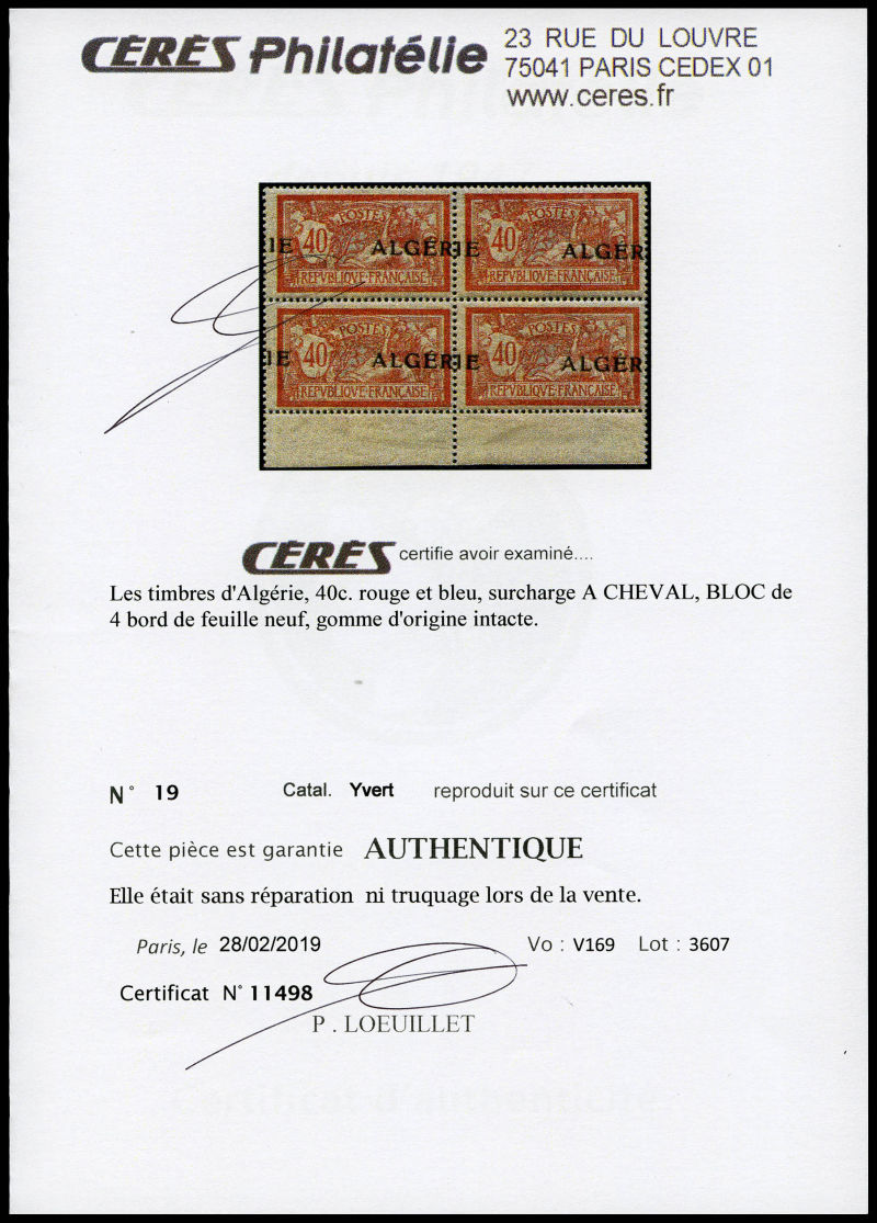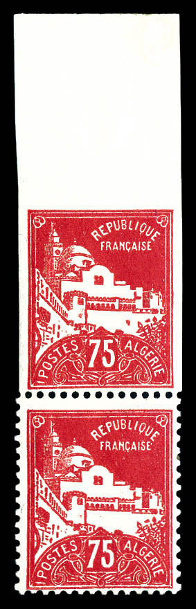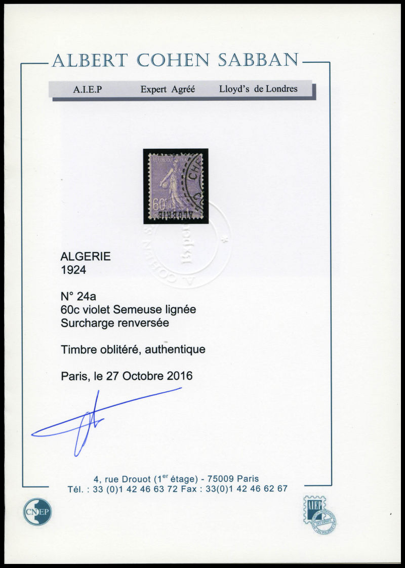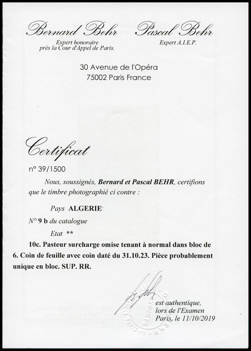 3135 image75c Pasteur: Double surcharge ALGERIE. SUP (signé Brun/certificat) Qualité: * Cote: 475 euros (Image)