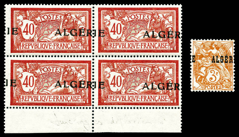3131 imageN°19a, 40c Merson, surcharge à cheval sur bloc de 4 bas de feuille +3c blanc surcharge à cheval (n°3a). SUP (certificat) Qualité: ** Cote: 660 euros (Image) (image2) (All Images)