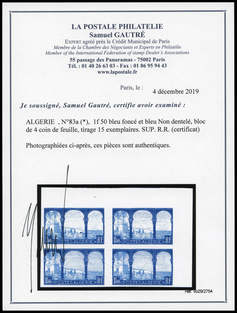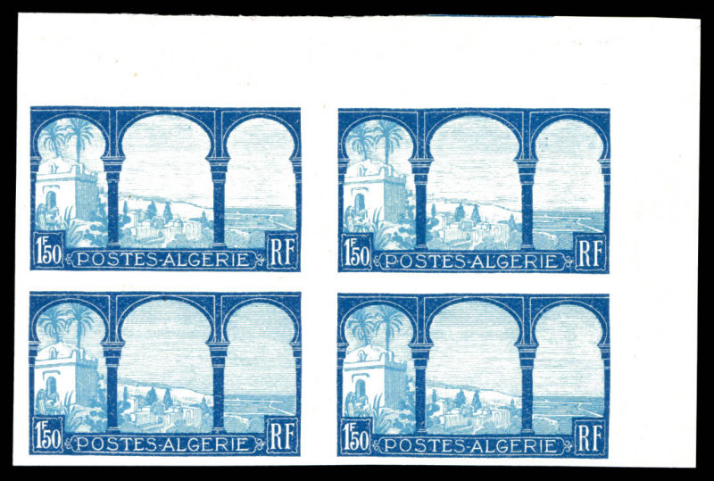 3148 imageN°83a, 1f 50 bleu foncé et bleu Non dentelé, bloc de 4 coin de feuille, tirage 15 exemplaires. SUP. R.R. (certificat) Qualité: (*) Cote: 3800 euros (Image) (image2) (All Images)