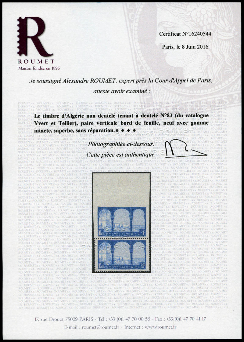 3149 imageN°83aa, 1f 50 bleu foncé et bleu: Non dentelé tenant à normal. SUP. R.R.R. (signé Calves/certificat) Qualité: ** Cote: 7800 euros (Image) (image2) (image3) (All Images)