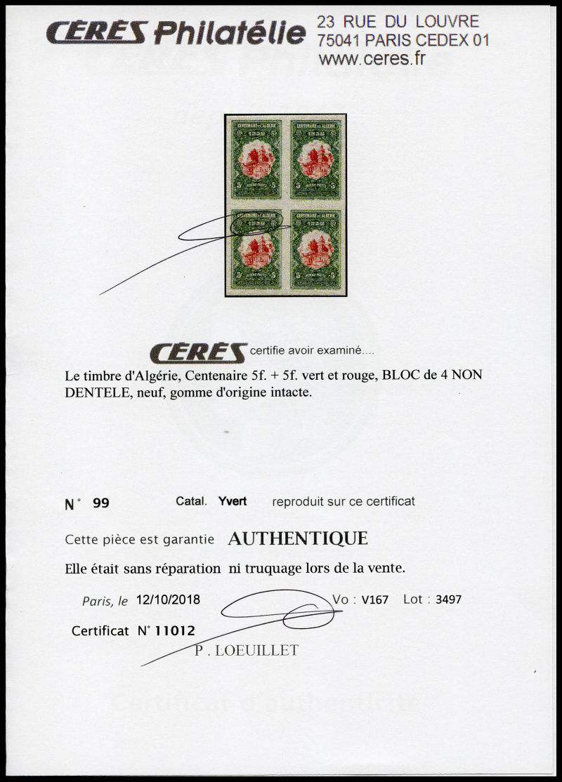 3152 imageN°87/99, Série Centenaire non dentelée en bloc de quatre. SUPERBE. R. (certificat) Qualité: ** Cote: 4200 euros (Image) (image2) (All Images)
