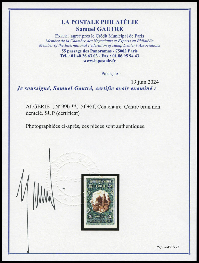 3155 imageN°99ba, 5f +5f, Centenaire. Centre brun non dentelé. SUP (certificat) Qualité: ** Cote: 1250 euros (Image) (image2) (All Images)