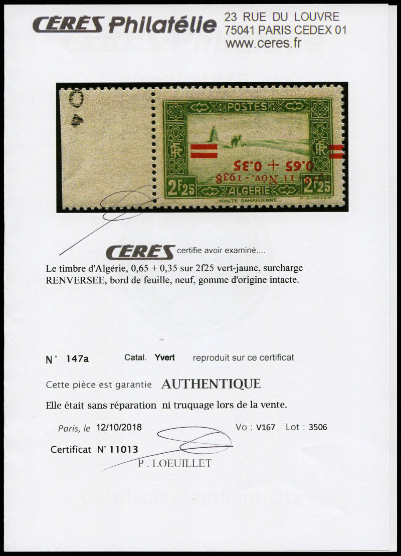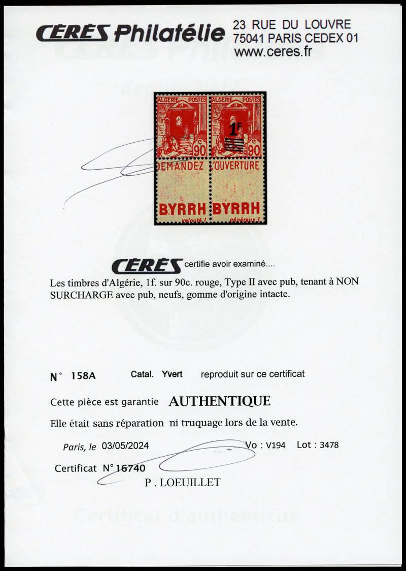 3160 imageN°158Aaa, Surcharge renversée avec bande pub, très frais. SUP (certificat) Qualité: ** Cote: 260 euros (Image)