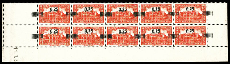 3158 imageN°148a, 25c sur 50c rouge: double surcharge sur bloc de 10 exemplaires bas de feuille daté. SUP (certificat) Qualité: ** Cote: 1750 euros (Image)