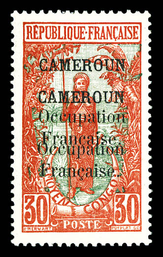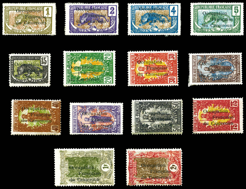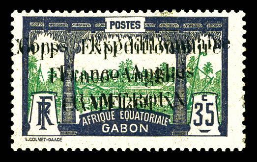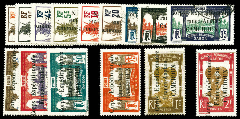 Série complête timbres du Gabon surchargés 'CORPS EXPEDITIONNAIRE FRANCO ANGLAIS CAMEROUN' (N°38, 40, 43, 44, 45 et 46 obl), les 15 valeurs TB, RARE (signés Roumet/certificat) Qualité: * Cote: 3200 euros (Image)