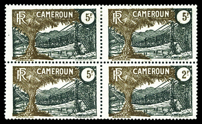 3223 imageN°130b, 2f noir et brun sur azuré tenant à 5f (normaux*) en bloc de quatre. SUP. R.R (signé/certificat) Qualité: ** Cote: 3000+ euros (Image)