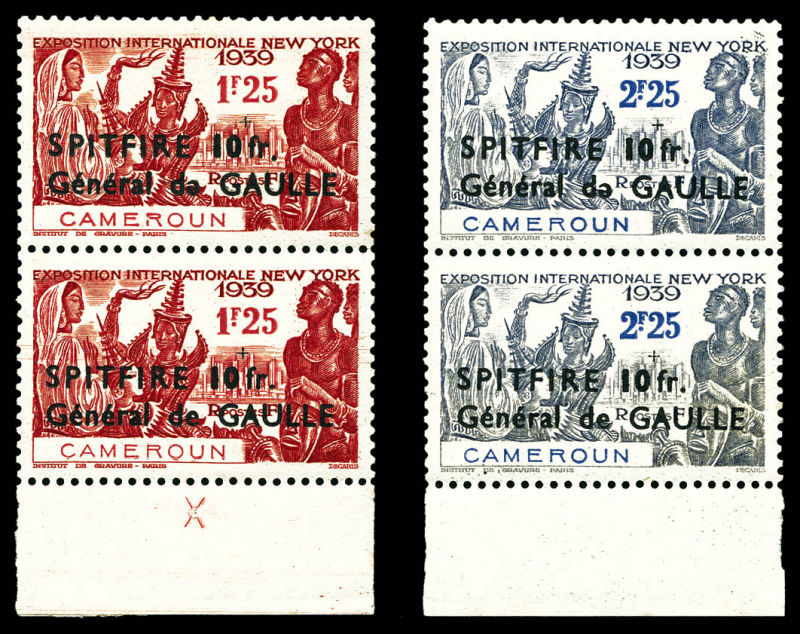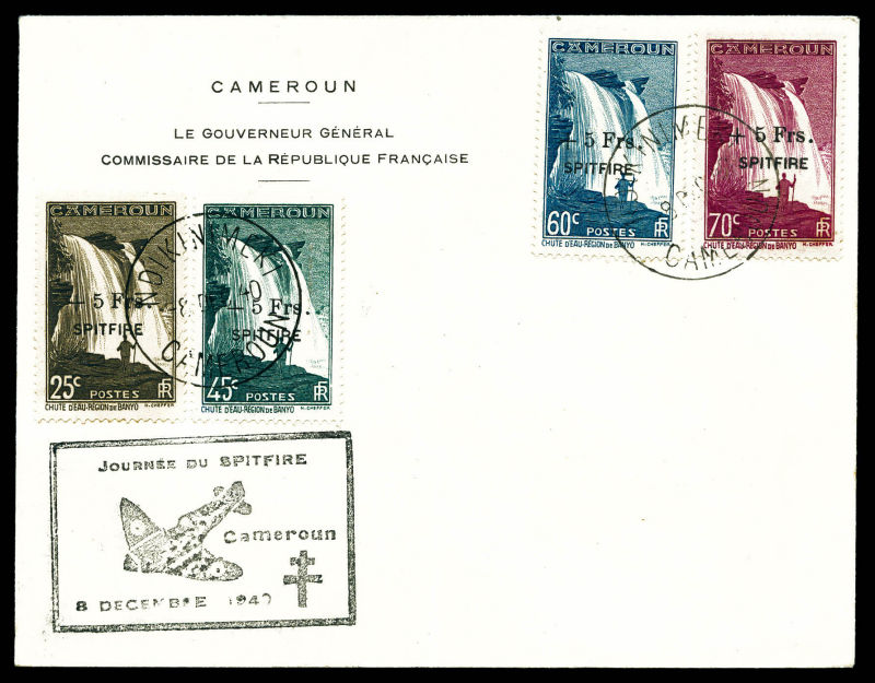 3226 imageN°236/239, 1940, Spitfire 25c, 45c, 60c et 70c, série complète obl DOUALA le 8 dec 40 sur lettre avec griffe commemorative 'Journée du Spitfire'. TTB (certificat) Qualité: Oblitéré Cote: 620 euros (Image)