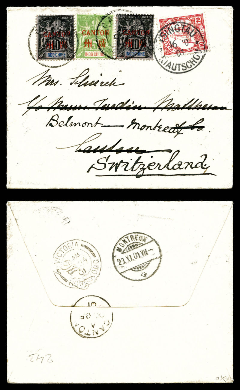 3230 imageAFFRANCHISSEMENT MIXTE: 5c vert-jaune + 10c noir sur lilas (2ex) oblitération bilingue du 25 oct 1901 et timbre Allemand 10c Kiautschou oblitéré càd Tsingtau/Kiautschou sur petite lettre pour la Suisse, cachet de transit et arrivée au verso. SUPERBE. R.R.R. (certificat) Qualité: Oblitéré (Image)