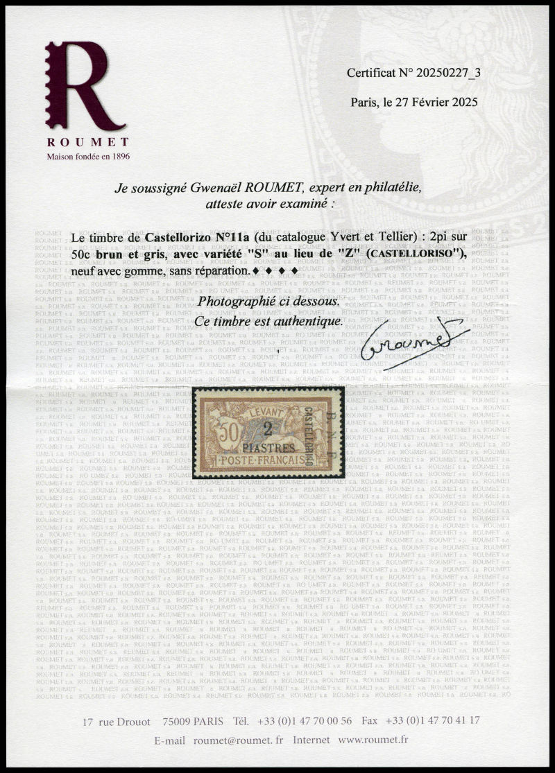 3242 imageN°11a, 2 pi sur 50c brun et gris, variété 'S' au lieu de 'Z' dans CASTELLORIZO. TTB (signé Brun/certificats) Qualité: * Cote: 790 euros (Image) (image2) (All Images)