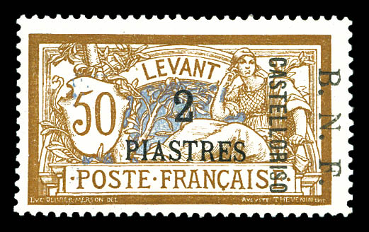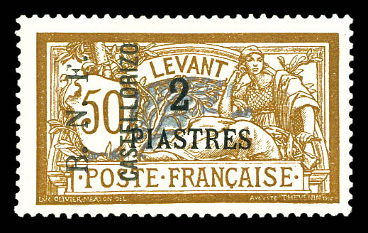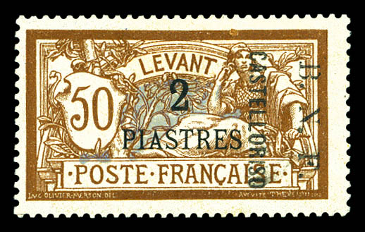 3244 imageN°11, 2 pi sur 50c brun et gris: Triple surcharge dont 2 horizontales renversées et à cheval sans B.N.F et variété 'S' au lieu de 'Z' dans CASTELLORIZO. PIECE SUPERBE ET UNIQUE. R.R.R. (signé Margues/certificats) Qualité: * (Image) (image2) (All Images)