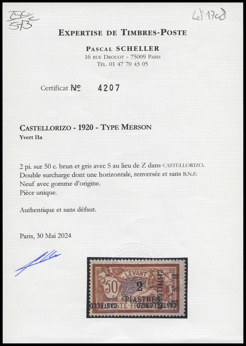 3243 imageN°11a, 'CASTELLORISO' ('S' au lieu de 'Z'), très frais. SUP (signé Brun/certificat) Qualité: * Cote: 790 euros (Image)