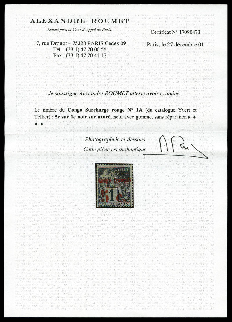 3283 imageN°1A, 5c sur 1c, surcharge rouge, tirage 100 exemplaires. SUPERBE. R.R (signé Brun/certificats) Qualité: * Cote: 8750 euros (Image) (image2) (image3) (All Images)