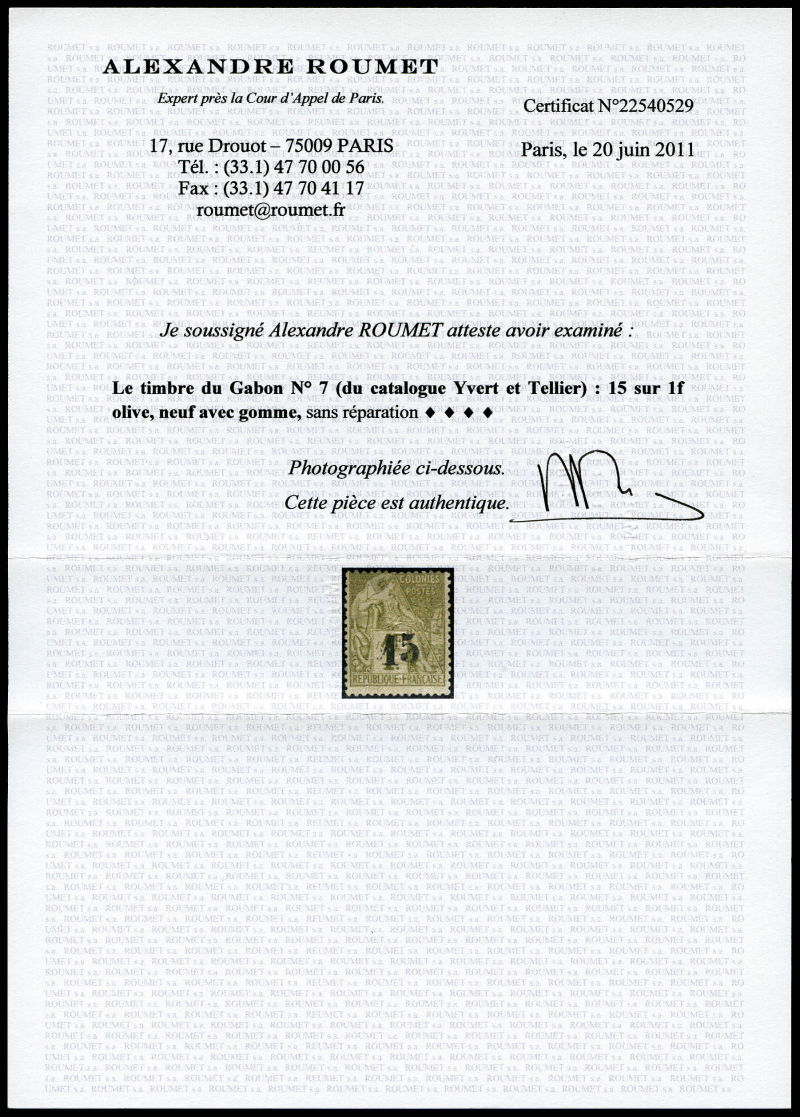 3291 imageN°7, 15 sur 1F olive, quasi **, SUP. R. (signé Brun/Calves/certificat) Qualité: * Cote: 3150 euros (Image) (image2) (image3) (All Images)