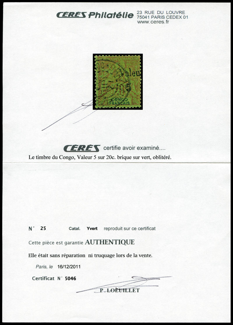 3294 imageN°25, 5c sur 20c. SUPERBE. R.R.R. (signé Calves/certificats) Qualité: Oblitéré Cote: 8200 euros (Image) (image2) (image3) (All Images)