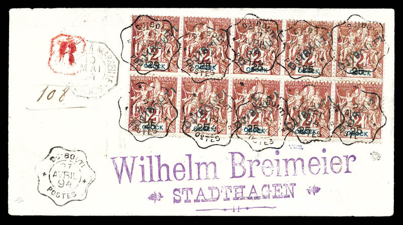 3337 imageN°2, 25c sur 2c lilas-brun sur paille en bloc de 10 exemplaires obl càd de Djibouti le 27 avril 1894 sur lettre recommandée pour l'Allemagne, au verso arrivée le 23 mai. SUP. R. (signé/certificat) Qualité: Oblitéré (Image)