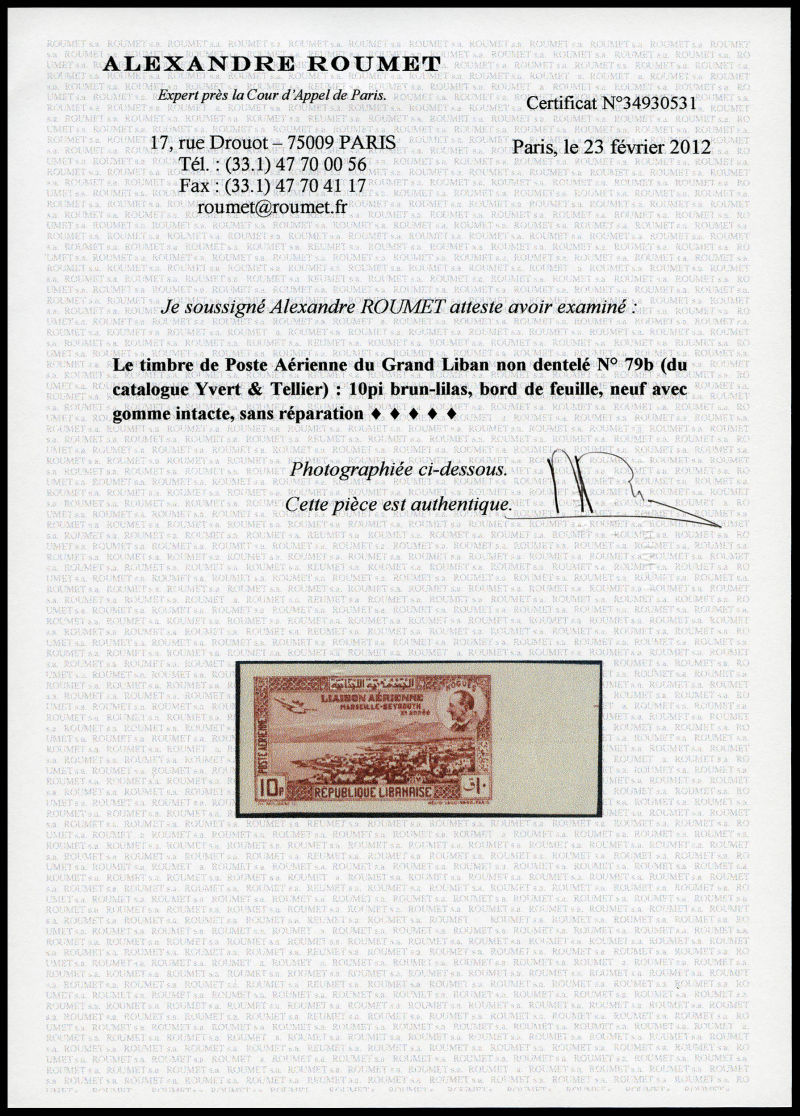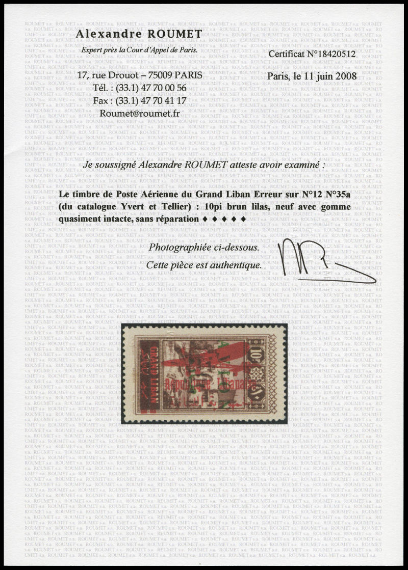 3550 imageN°58A, Non émis, Traité Franco-Libanais, 10pi vert, SUP. R. (certificat) Qualité: ** Cote: 630 euros (Image)