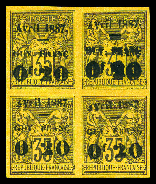3590 imageN°4, 0f20 sur 35c: exemplaire Double surcharge tenant à 2 exemplaires avec Av renversé dans Avril tenant à normal en bloc de 4. SUP. R. (signé Bernichon/certificat) Qualité: (*) (Image)