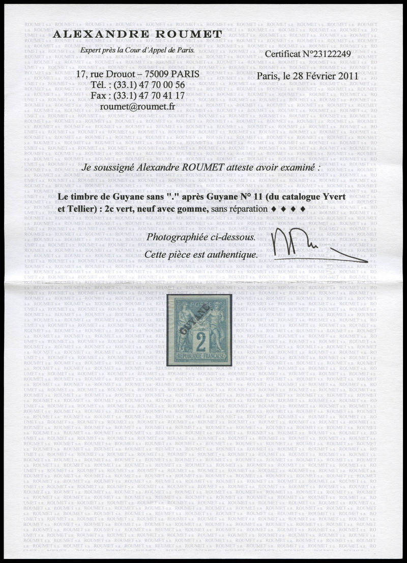 3595 imageN°11b, 2c vert: Sans point après Guyane, belles marges. SUP. R. (signé Scheller/certificats) Qualité: * Cote: 1400 euros (Image) (image2) (All Images)