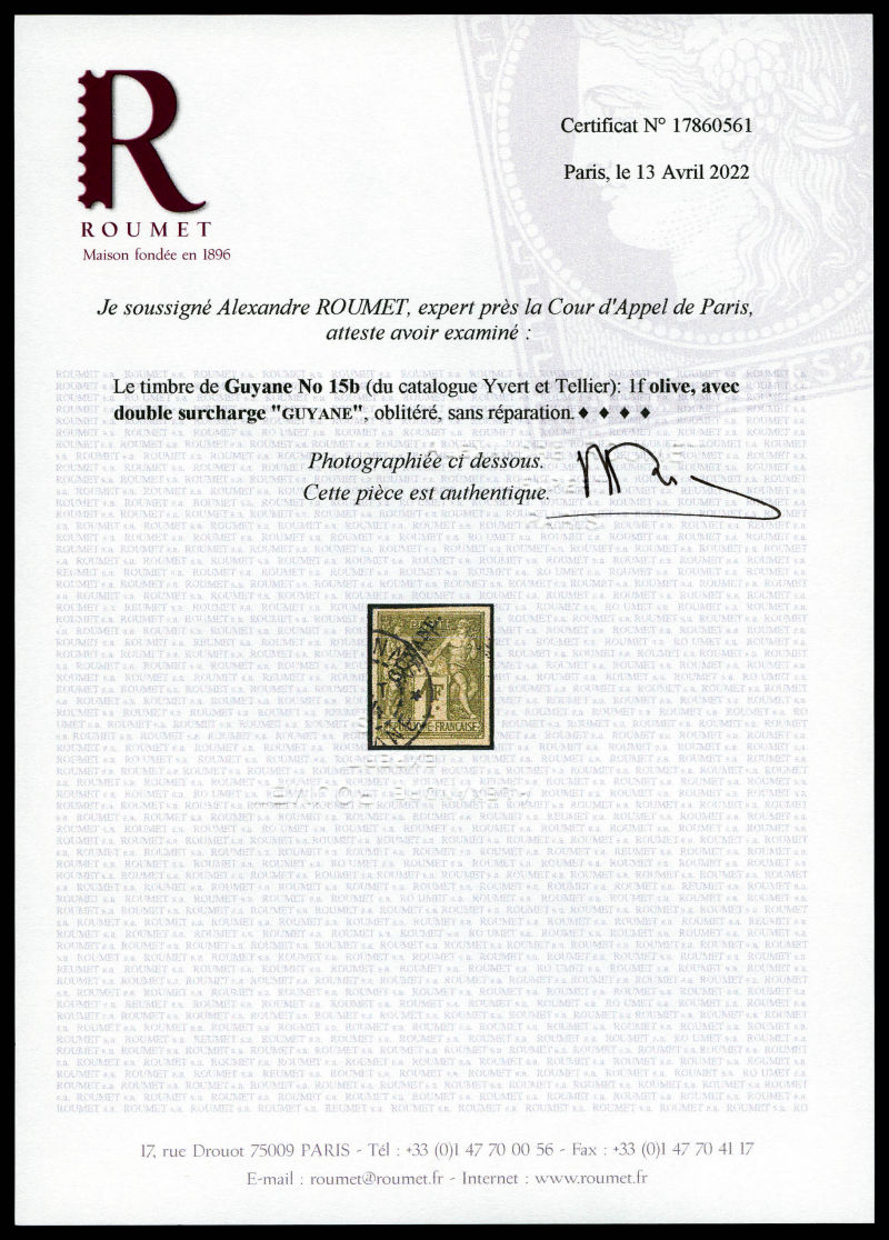 3597 imageN°15b, 1f olive: DOUBLE SURCHARGE. SUP. R. (signé/certificats) Qualité: Oblitéré Cote: 900 euros (Image) (image2) (All Images)