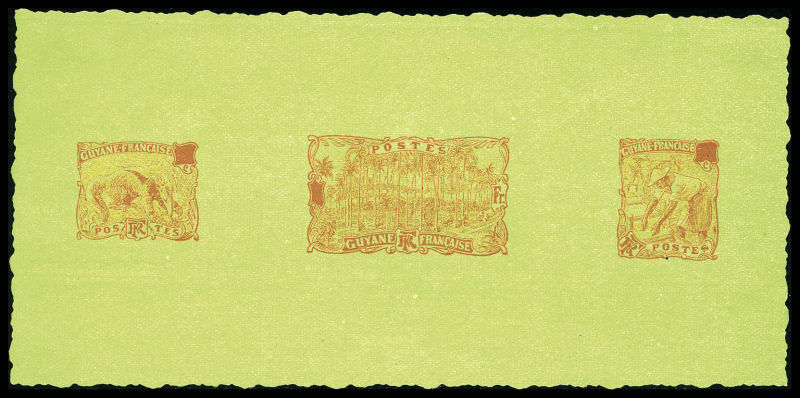 3600 image49 + 55 + 63, épreuve collective des 3 poinçons sans faciale en rouge sur papier vert dentelé, Tamanoir, chercheur d'or, palmiers. (Maury). Qualité: (*) Cote: 1350 euros (Image)