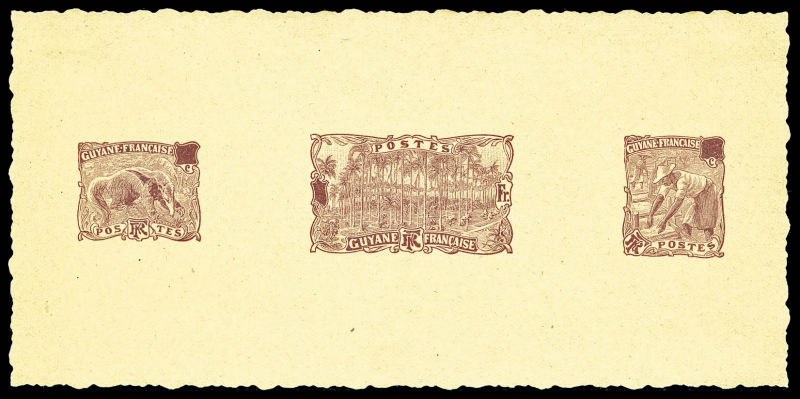 3601 image49 + 55 + 63, épreuve collective des 3 poinçons sans faciale en brun foncé sur papier crème dentelé, Tamanoir, chercheur d'or, palmiers. (Maury). Qualité: (*) Cote: 1350 euros (Image)