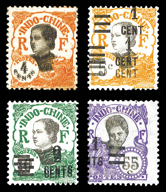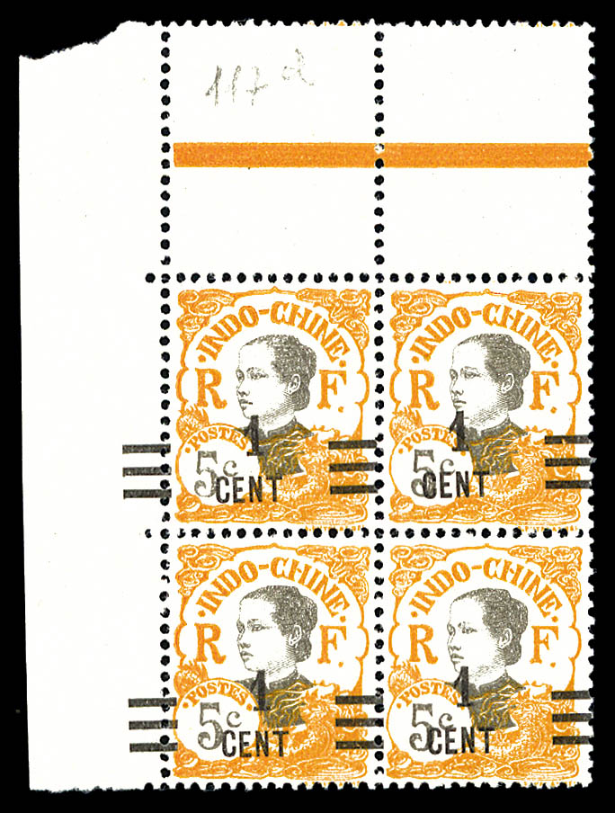 3665 imageN°117f, 1c sur 5c jaune-orange, surcharge déplacée à gauche en bloc de quatre cdf. SUP (certificat) Qualité: ** Cote: 640 euros (Image)