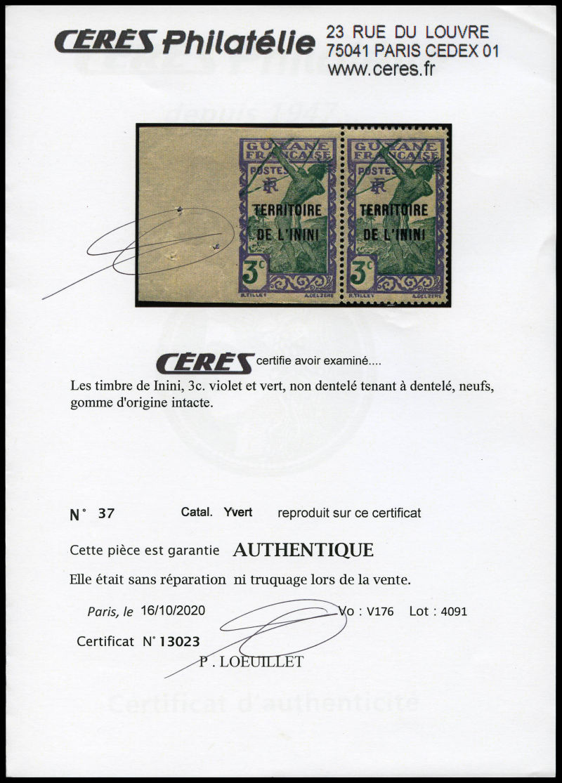 3676 imageN°36, 3c violet et vert-bleu: non dentelé tenant à dentelé en paire bdf. SUP (certificats) Qualité: ** (Image) (image2) (All Images)