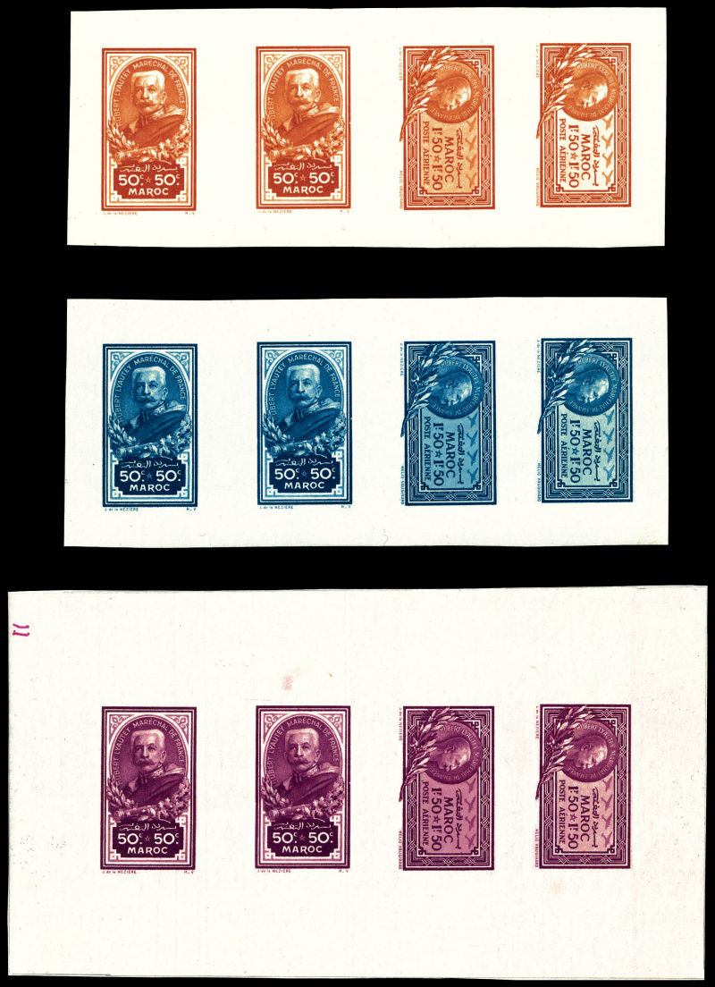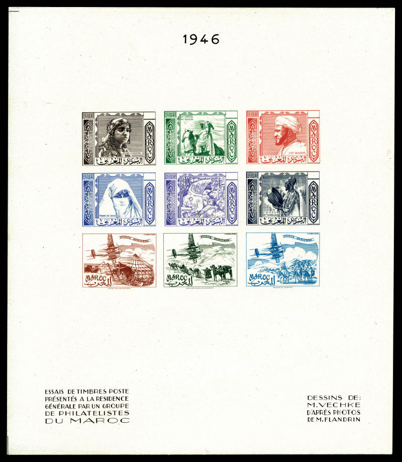 3783 imageNon Emis, épreuve collective sur feuillet 215x185mm composée de 6 exemplaires Poste et 3 exemplaires de PA, par M. Vechke, daté 1946. SUP. R. (certificat) Qualité: (*) (Image)