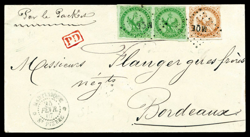 3796 image5c en paire + 40c Aigle obl losange 'MQE' + càd de St PIERRE le 25 février 1867 sur lettre avec mention manuscrite/Paquebot pour Le Bordeaux, jolie composition avec le 5c vert. TTB (certificat) Qualité: Oblitéré (Image)